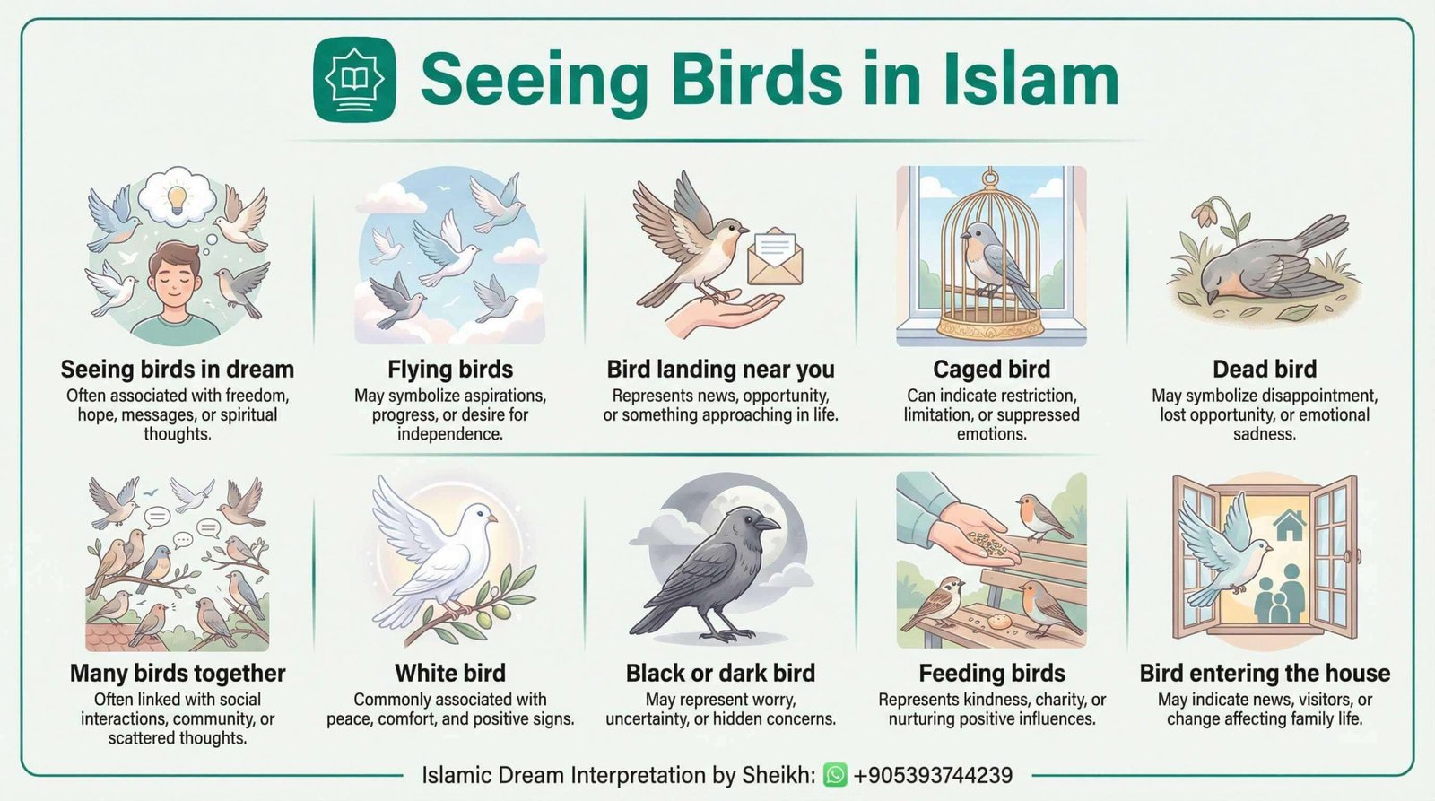| Dream of birds entering house in Islam | Birds entering the house can symbolize good news, guests, or blessings. However, depending on bird type, it may also represent worries. |