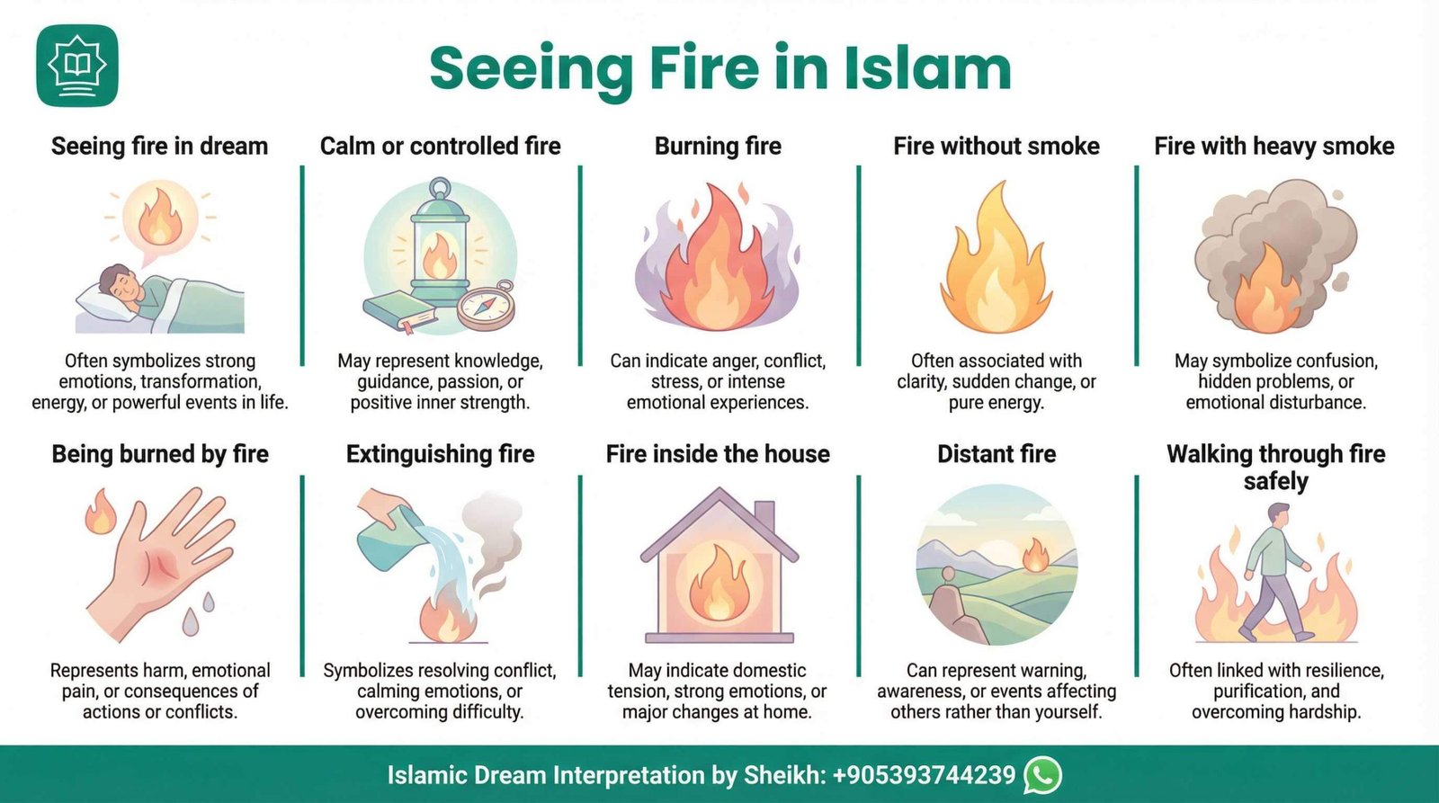 | Fire without smoke | May represent guidance, spiritual light, and knowledge that benefits the dreamer. |