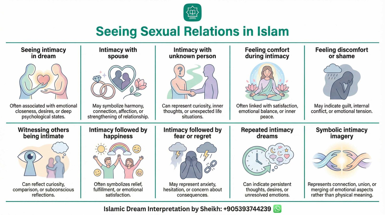 | Dream of sex with jinn in Islam | Represents influence of evil forces, black magic, or being trapped by temptation. Seeking refuge in Allah, reading Qur’an, and spiritual protection is recommended. |