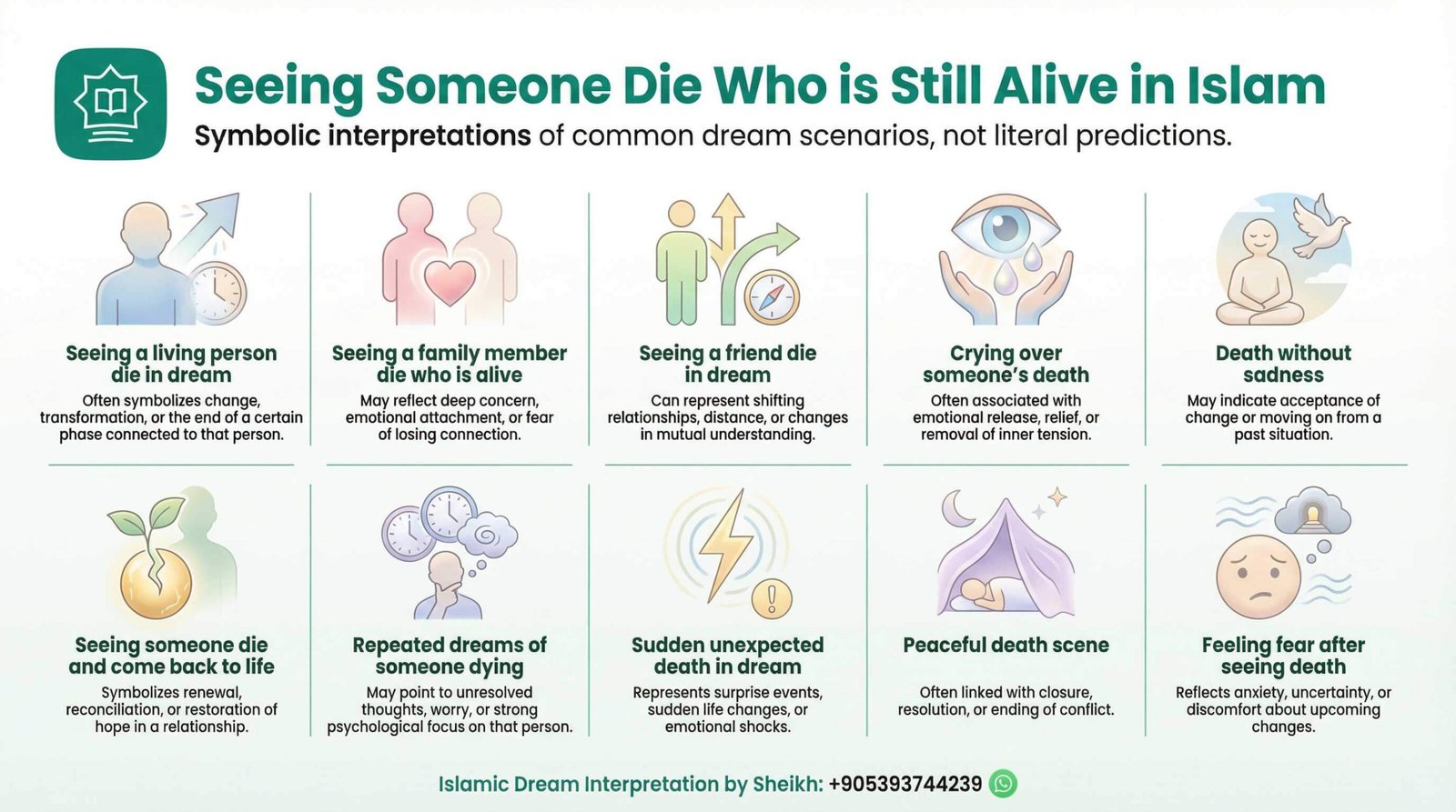 Imam Ja’far al-Sadiq often interpreted dreams involving death as symbols of transition. According to him, seeing an alive person dead in a dream may indicate that the person will undergo significant changes, leading to a new phase in life. It may also represent the end of certain habits or situations, making way for new beginnings and personal growth.