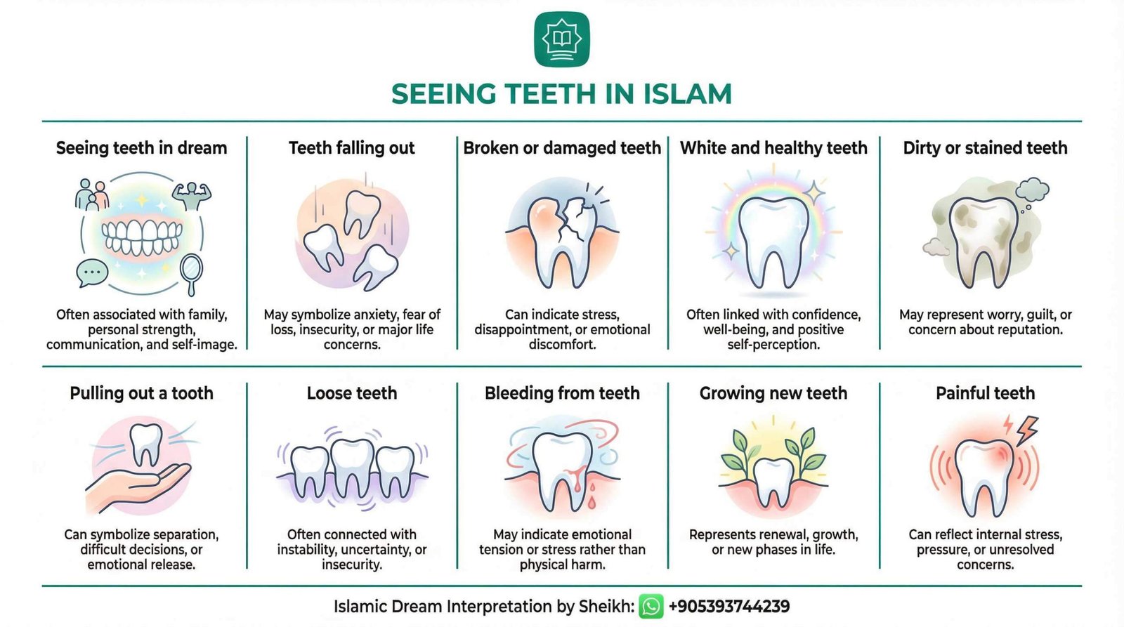 | Dream of clean teeth in Islam | Clean teeth symbolize harmony, blessings, and respect among relatives. It is a sign of maintaining good ties and a healthy reputation. |