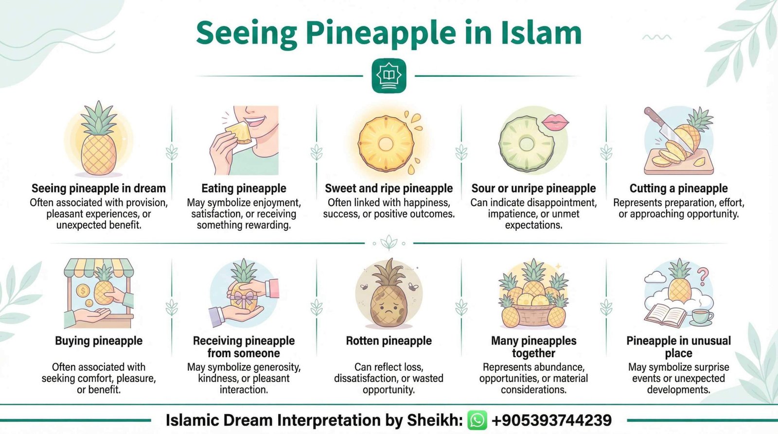 In Islamic dream interpretation, seeing a pineapple can symbolize various aspects depending on the context of the dream. Traditionally, pineapples are not commonly mentioned in classical Islamic dream interpretation texts, but they can be considered as symbols of hospitality, wealth, or new opportunities. This fruit, with its hard exterior and sweet interior, might suggest the hidden rewards coming from enduring a difficult situation. If you want to read more about this topic, follow the dream interpretation in Islam. Need a Dream Interpretation by a Sheikh? Click here to get in touch instantly on WhatsApp: +905393744239.