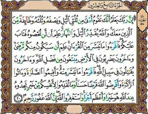 - إِنَّ رَبَّكَ يَعْلَمُ أَنَّكَ تَقُومُ أَدْنَى مِن ثُلُثَيِ اللَّيْلِ وَنِصْفَهُ وَثُلُثَهُ وَطَائِفَةٌ مِّنَ الَّذِينَ مَعَكَ وَاللَّهُ يُقَدِّرُ اللَّيْلَ وَالنَّهَارَ عَلِمَ أَن لَّن تُحْصُوهُ فَتَابَ عَلَيْكُمْ فَاقْرَؤُوا مَا تَيَسَّرَ مِنَ الْقُرْآنِ عَلِمَ أَن سَيَكُونُ مِنكُم مَّرْضَى وَآخَرُونَ يَضْرِبُونَ فِي الأَرْضِ يَبْتَغُونَ مِن فَضْلِ اللَّهِ وَآخَرُونَ يُقَاتِلُونَ فِي سَبِيلِ اللَّهِ فَاقْرَؤُوا مَا تَيَسَّرَ مِنْهُ وَأَقِيمُوا الصَّلاةَ وَآتُوا الزَّكَاةَ وَأَقْرِضُوا اللَّهَ قَرْضًا حَسَنًا وَمَا تُقَدِّمُوا لأَنفُسِكُم مِّنْ خَيْرٍ تَجِدُوهُ عِندَ اللَّهِ هُوَ خَيْرًا وَأَعْظَمَ أَجْرًا وَاسْتَغْفِرُوا اللَّهَ إِنَّ اللَّهَ غَفُورٌ رَّحِيمٌ